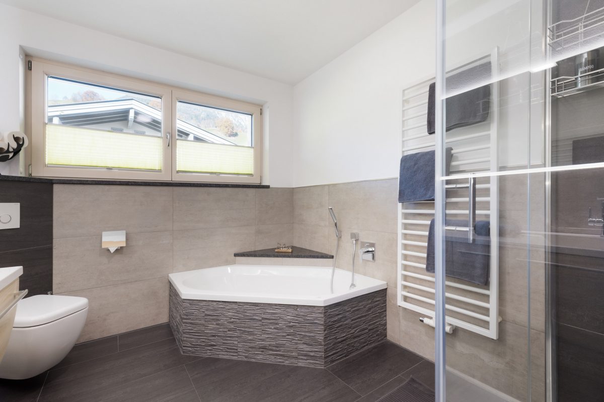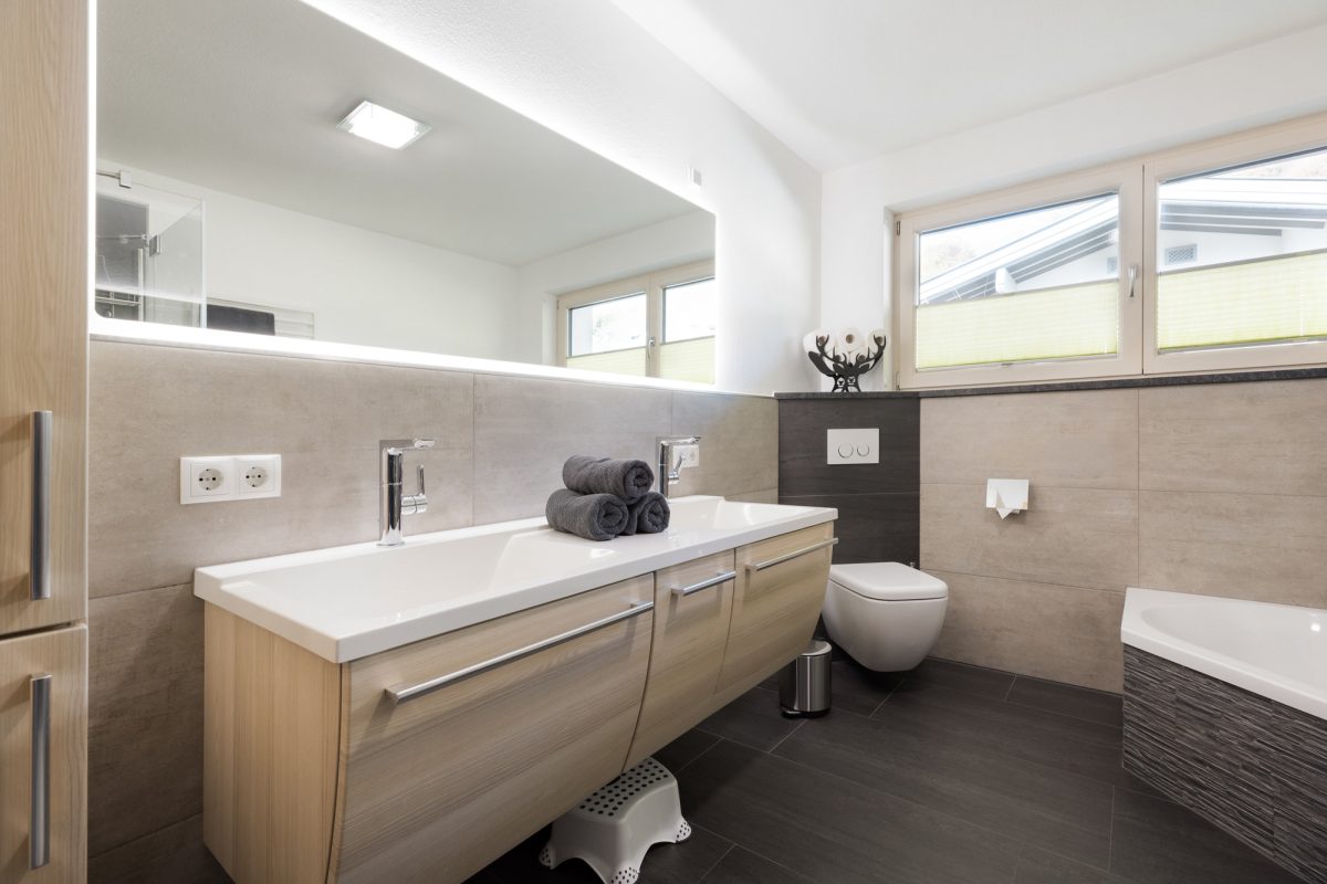 Das Badezimmer verfügt über ein großes Doppelwaschbecken, Dusche sowie Badewanne. Ein separates WC ist vorhanden.