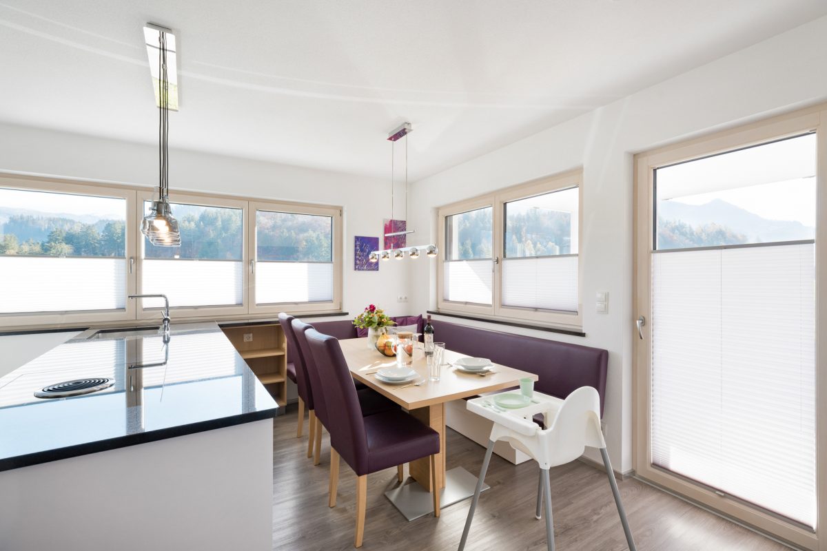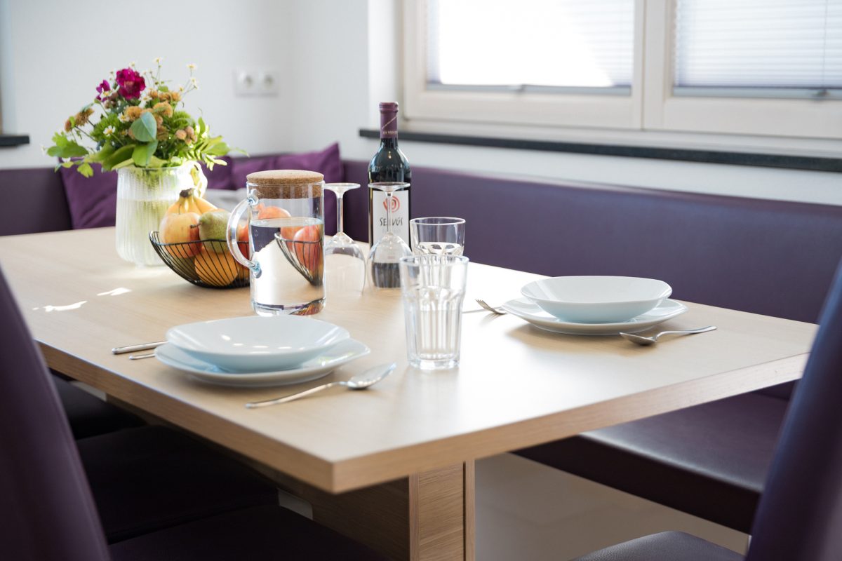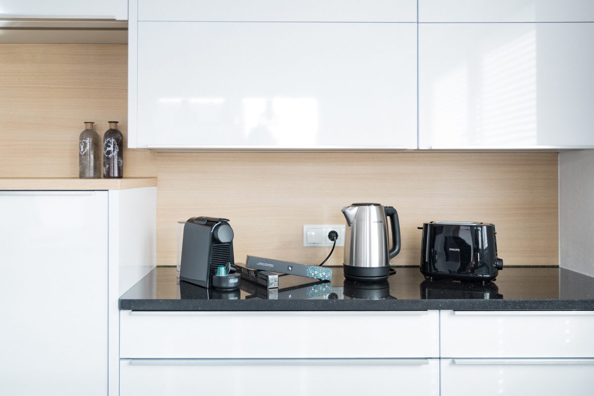 Das bestens ausgestattete Apartment bietet eine top moderne Küche mit großer Kochinsel, großem Kühlschrank (inkl. Gefrierfächer), Backofen, Mikrowelle und großem Esstisch.